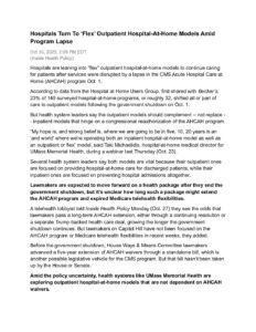 31 Oct Hospitals Turn To ‘Flex’ Outpatient Hospital-At-Home Models Amid Program Lapse Posted at 14:03h in by Eve Corriveau 0 Comments 0 Likes