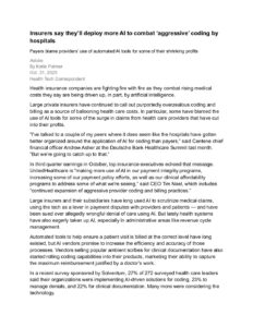 31 Oct Insurers say they’ll deploy more AI to combat ‘aggressive’ coding by hospitals Posted at 14:00h in by Eve Corriveau 0 Comments 0 Likes